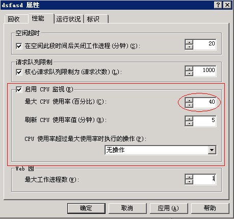 可以在IIS的应用程序池中对该站点的CPU资源进行限制,如图: