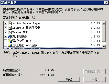6、勾选“Active Server Pages”、“Internet 数据连接器”、“WebDAV 发布 ”、“在服务器端的包含文件”,然后一路点“确定”,最后点“下一步”开始安装,如图: