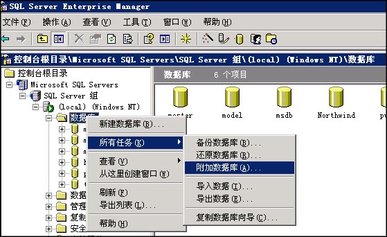 2、点击“数据库”--“所有任务”--“附加数据库”,如图: