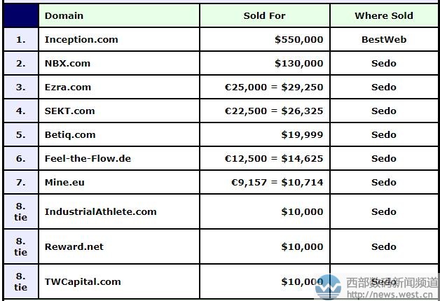 来源西部数码新闻资讯,原文链接:昂贵的“开端”:英文域名inception以366万元居DN榜首