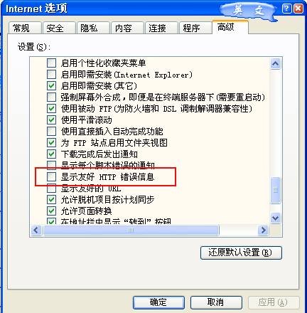 方法为:请打开浏览器,选择工具,internet选项,高级,在高级中的浏览项目里面有一个"显示http友好错误提示"的复选框,请取消该复选框,这样您可以获得正确的错误提示。 在获得正确的错误提示之后,您就可以根据该错误提示检查您具体的出错原因了。根据出错的具体原因,再进行相应调试即可解决。