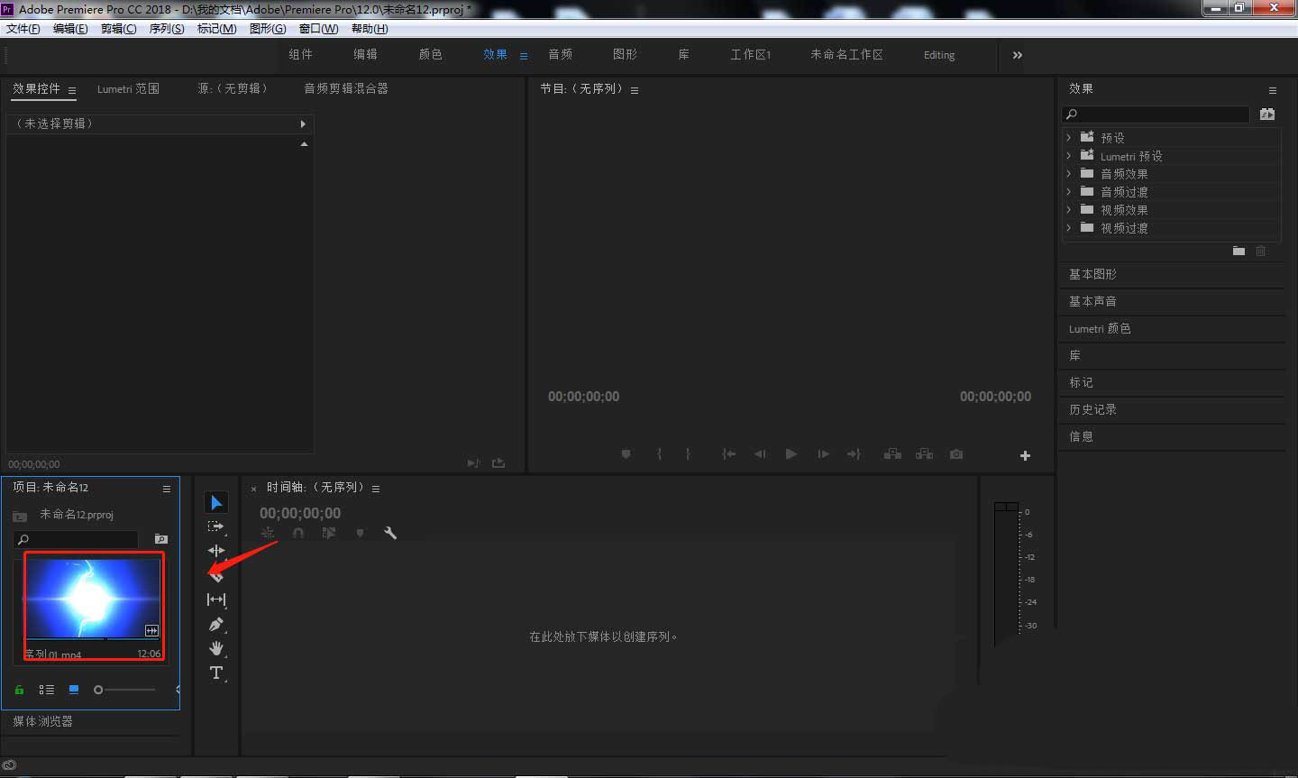 3、长按鼠标左键,将左侧导入的视频素材拖动到右侧时间轴上方。