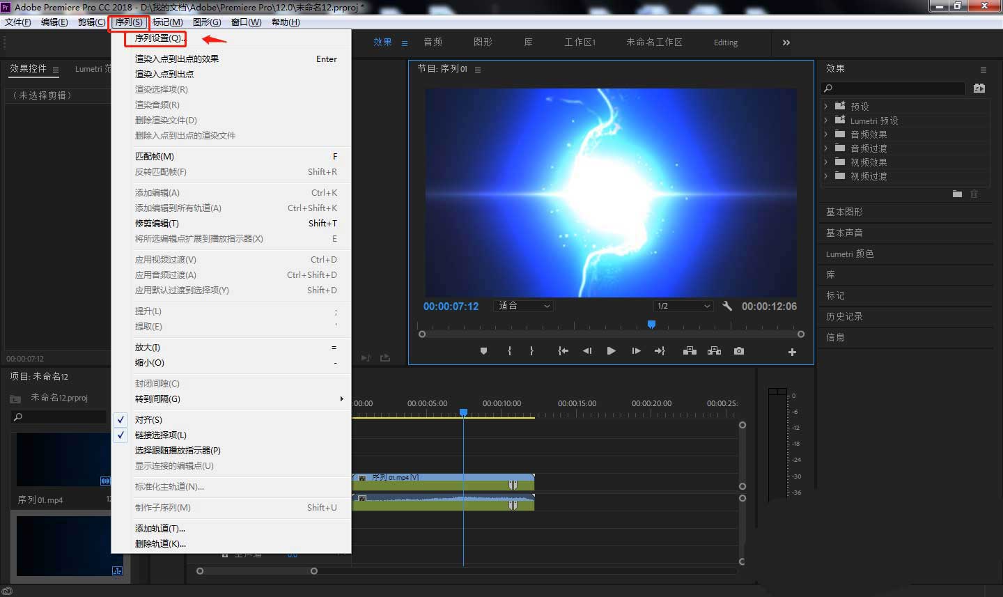4、点击顶部工具栏中的“序列”——“序列设置”。