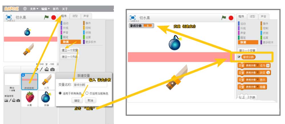 3、创建成绩变量。新建一个变量,名称为“游戏分数”,用于记录切水果的数量,也就是游戏成绩。