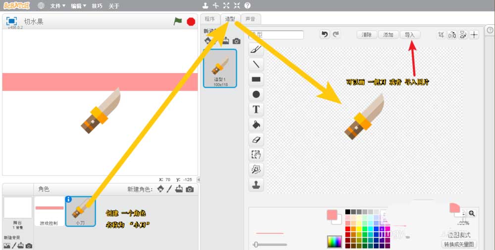 切水果的游戏内容:人控制一把小刀,小刀切到水果加分,切到炸弹则游戏结束。下面我们就来看看Scratch通过小刀、水果、炸弹三个角色,来实现切水果游戏功能的技巧,详细请看下文介绍。