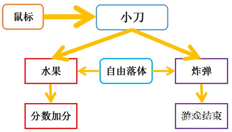 1、程序运行过程。水果和炸弹做自由落体运动,鼠标控制小刀去切水果。