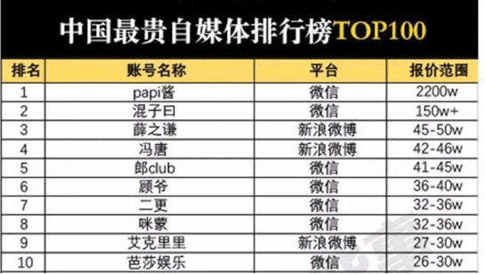 下图是一份自媒体广告报价表,可以看出,榜单前十名有七名都源自微信公众号这个平台,其中第一名是今年炙手可热的新星PAPI酱,微信公众号广告的报价达到了2200万元,在榜单上遥遥领先。