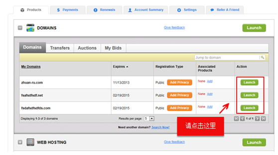 3、展开域名列表后,找到需要修改DNS的域名,点击对应的【Launch】按钮。