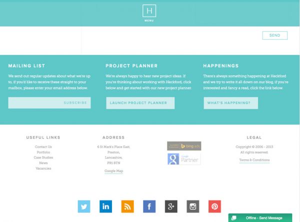 页脚内容不如网站主题部分,页脚内容只是容纳很少一部分信息,并且这种信息不是很重要但是确实网站必须。我们在设计网站页脚内容就需要让内容变得具有可读性。还有就是页脚内容的文本元素和背景颜色都需要跟网站主题部分进行区分,这样做的好处就是让网站页脚和网站主题部分形成鲜明的对比。