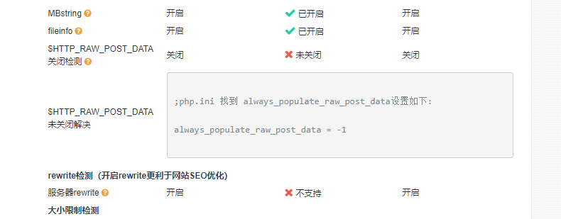 修改php.ini文件中always_populate_raw_post_data = -1 (为off无法检测通过)