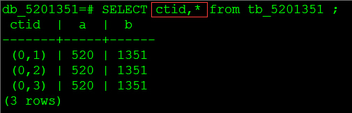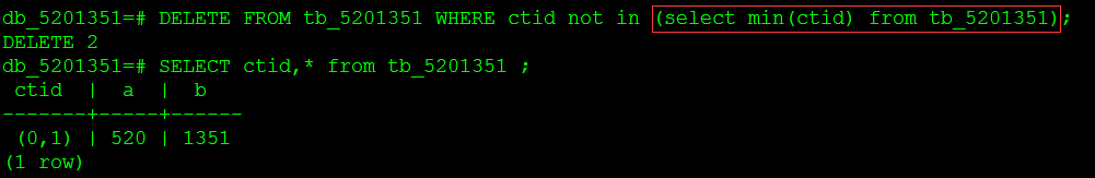这样我们就可以使用唯一标识的ctid对重复数据进行删除操作,使用以下两种方式都可以删除tb_5201351表中2条数据。