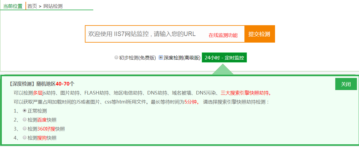 IIS7网站监控工具可以做到提前预防各类网站劫持、并且是免费在线查询、适用于各大站长、政府网站、学校、公司、医院等网站。他可以做到24小时定时监控、同时它可以让你知道网站是否被黑、被入侵、被改标题、被挂黑链、被劫持、被墙及DNS是否被污染等等功能、更是拥有独家检测网站真实的完全打开时间、让你作为站长能清楚的知道自己网站的健康情况!