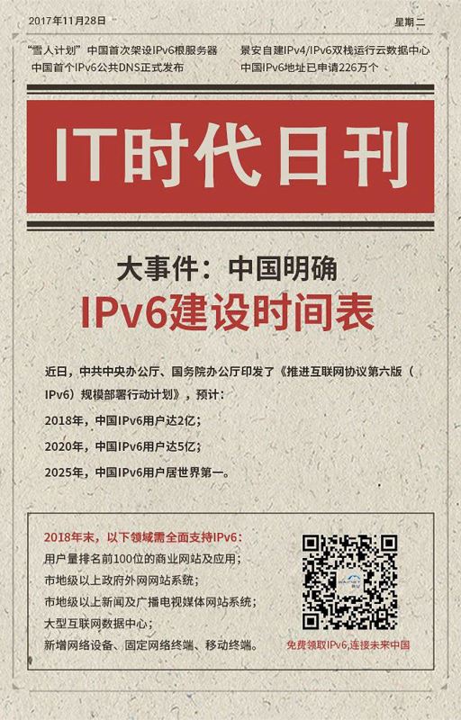 “11月26日,中共中央办公厅、国务院办公厅印发《推进互联网协议第六版(IPv6)规模部署行动计划》(以下简称“计划”),首次从国家层面提出,用5-10年时间建成全球最大规模的IPv6商业应用网络。计划到2018年末国内IPv6活跃用户数要达到2亿……”