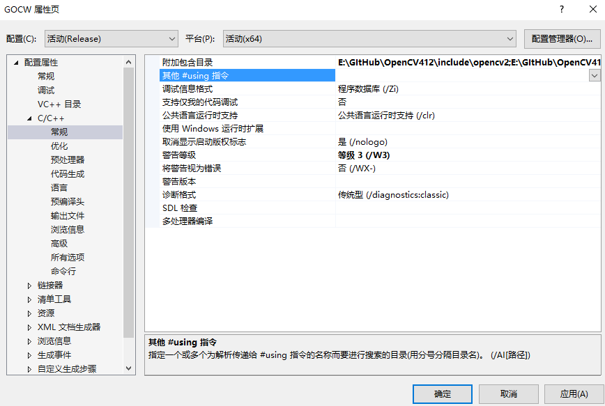 特别需要注意,正确编译GOCW需要OpenCV的正确配置,所以需要正确设置include和lib,并且保证对应版本的dll文件能够被正确访问。