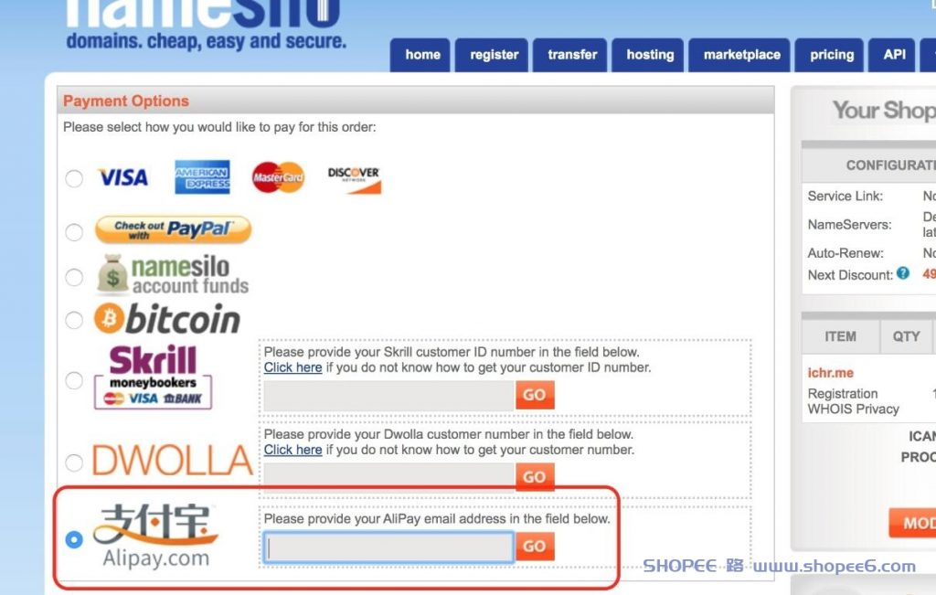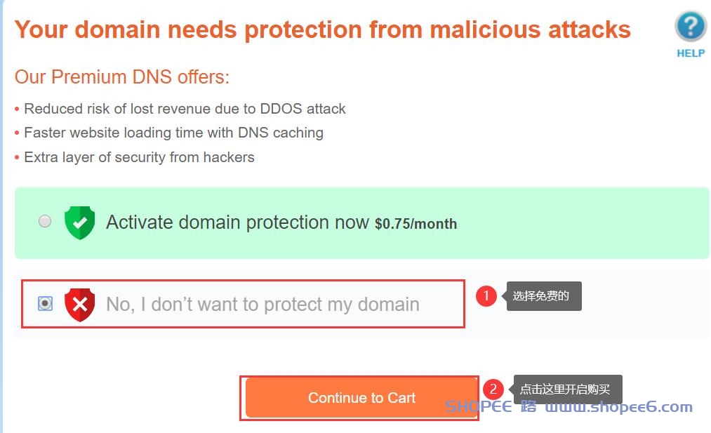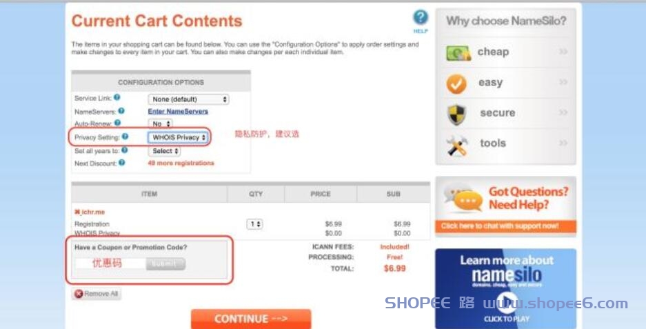4、进入购物车了,如下图,选择域名保护,同时输入优惠码:Shopee6 ,然后就获得了优惠了。