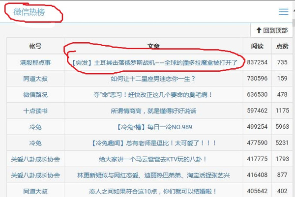 我们来看一下,阅读量最高的就是这篇文章,【突发】土耳其击落俄罗斯战机——全球的潘多拉魔盒被打开了,这个标题就非常吸引人,这个为什么吸引人呢!因为它的标题当中写了一个词叫突发,接下来写一个详细的事件,事件的结果是全球的潘多拉魔盒被打开了,关于潘多拉的魔盒大家应该有所了解,让读者感觉到跟他自己的利益相关,因为这个会影响到全世界人们的工作生活。
