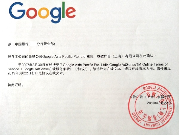 今天抽空更新一下本篇文章。8月末收到google的证明文件,一共5页,盖的骑缝章,第一页是中文的证明,有完整的章,后面4页是英文的“Google AdSense Online Terms of Service”,即google adsense在线服务条款,一共16条,后来上网一查,就是https://www.google.com/adsense/tc/2018/UnitedStatesOfAmerica.html这个页面的内容。