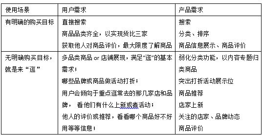 ① 大多数电商消费者的使用场景可分成两大类,如下表: