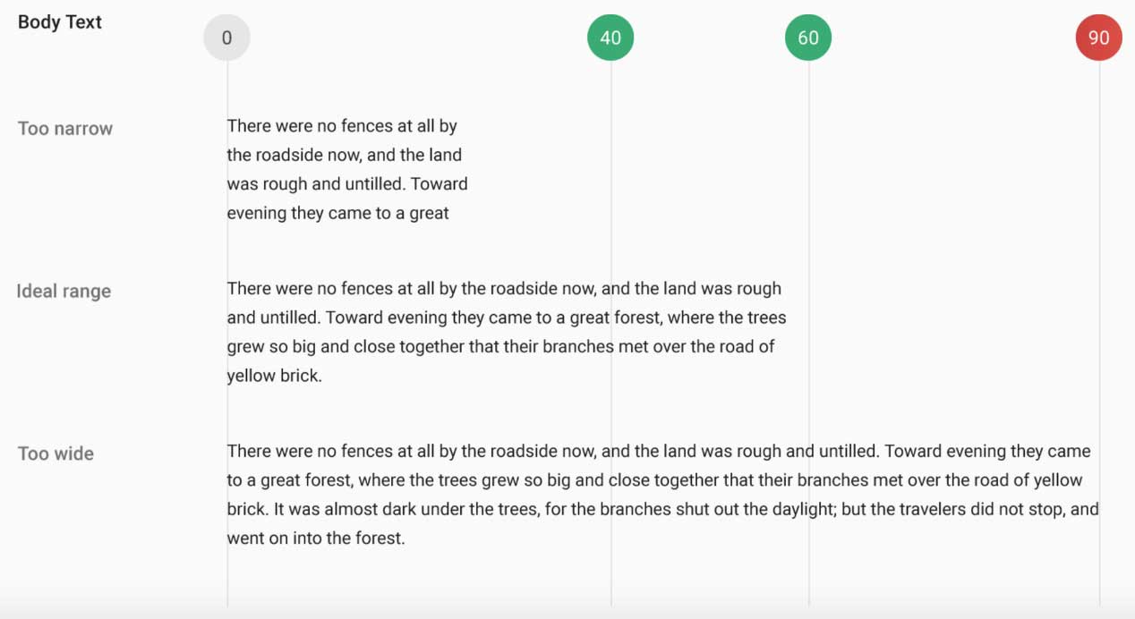 如果你想要一个良好的阅读体验,你应该每行约 60 个字符。在每行上拥有适当的字符数量是您的文本可读性的关键。如果每行文字太短,视线必须反复折回来,打破读者的节奏。如果一行文字太长,用户的眼睛将很难专注于文本。