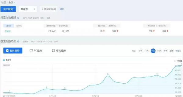 比如下图,是我在百度指数搜索关键词“圣诞节”的流量截图,距12.25日的圣诞节还有20天左右,可是每天搜索量已经高达34000,试问竞价员们,如此高的流量,你忍心错过吗!