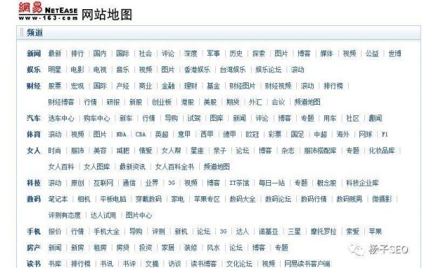 一般情况下,网站地图在大型网站是经常用到的,(由于网站地图在整个网站的优化中起到重要作用,因此,SEOer或网站建设者无论是什么网站都会规划一个网站地图,这以成为常态了)它是各种页面导航的补充,当大型网站内容比较多时,需要采用网站地图的形式,才能将整个庞大的网站结构完整地显示在用户面前。如下图网易的部分网站地图: