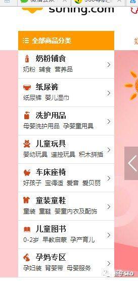 左侧导航,一般是为了弥补顶部导航而存在的,因为网站的每个栏目下面都会有很多详细的分类,这些分类不可能全部放置在顶部导航中,因此,需要采用左侧导航来进行弥补。如下图为苏宁电商的左侧导航: