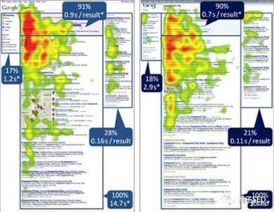 一些研究者用几种不同的页面做眼动仪测试,得到热度图,用颜色来表示浏览者眼光聚集的热度,分为最热的则为红色、较热的则为黄色、不热的则为蓝色和基本不关注的则为灰色。如下所示: