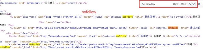 很简单,在自己网站的空白处点击右键,选择查看源代码,然后ctrl+F调出查找框,输入nofollow就可以了,如果你的网站有nofollow标签,就会显示出个数。