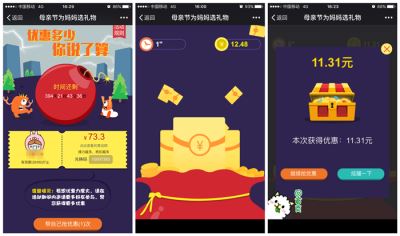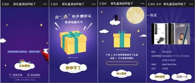 拆礼盒:粉丝将礼盒分享给指定数量的小伙伴,即能拆开商家的礼盒,中奖随机。将活动礼品设为母亲节相关,以“为妈妈拆礼盒”等为宣传口号,吸引粉丝积极参与。在提升粉丝活跃度的同时,拆礼盒应用的极强传播属性,还能大力提升商家品牌传播力度。