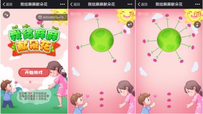 我给麻麻献朵花:世上只有麻麻好,麻麻待我像块宝。麻麻的爱与关怀无限大,我给麻麻献朵花。粉丝只需点击屏幕,往转动的圆盘上插上鲜花。在规定时间内,插的越多,得分越高。