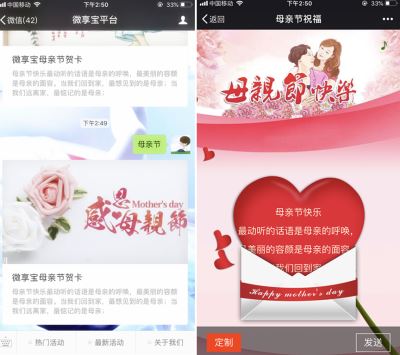 微贺卡:微享宝贺卡库拥有大量精美的母亲节贺卡。微贺卡支持商家上传背景音乐、企业logo、定制祝福词等操作,让贺卡更具营销特色。收到贺卡的粉丝也可以修改收卡人、发卡人,以及定制自己的祝福语,并将贺卡进行转发。微贺卡不仅能快速吸引粉丝的参与,其自带的节日特色与传播属性,也让商家在朋友圈的营销更轻松、更有力。微贺卡应用不但可用于维护与客户之间的感情、维护与粉丝之间的关系,精美又时尚的微贺卡,还容易受到客户和粉丝追捧,引起大众的共鸣和转发。也让商家在无形之中提高了传播率,扩张了营销势力.
