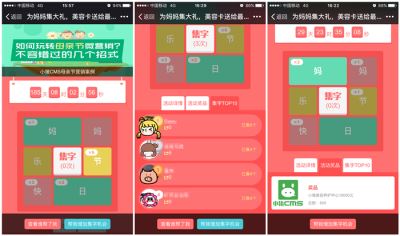 集字游戏:粉丝集齐商家给出的文字,比如“祝母亲节日快乐”,即可获得奖品。商家可以设置粉丝的初始抽字次数、每日新增次数,并让粉丝通过分享获得额外的抽字机会。结合节日气氛设置节日礼品,集字游戏不仅能大量吸引粉丝的关注,而且还能增强粉丝黏性,并带来不俗的传播效果。
