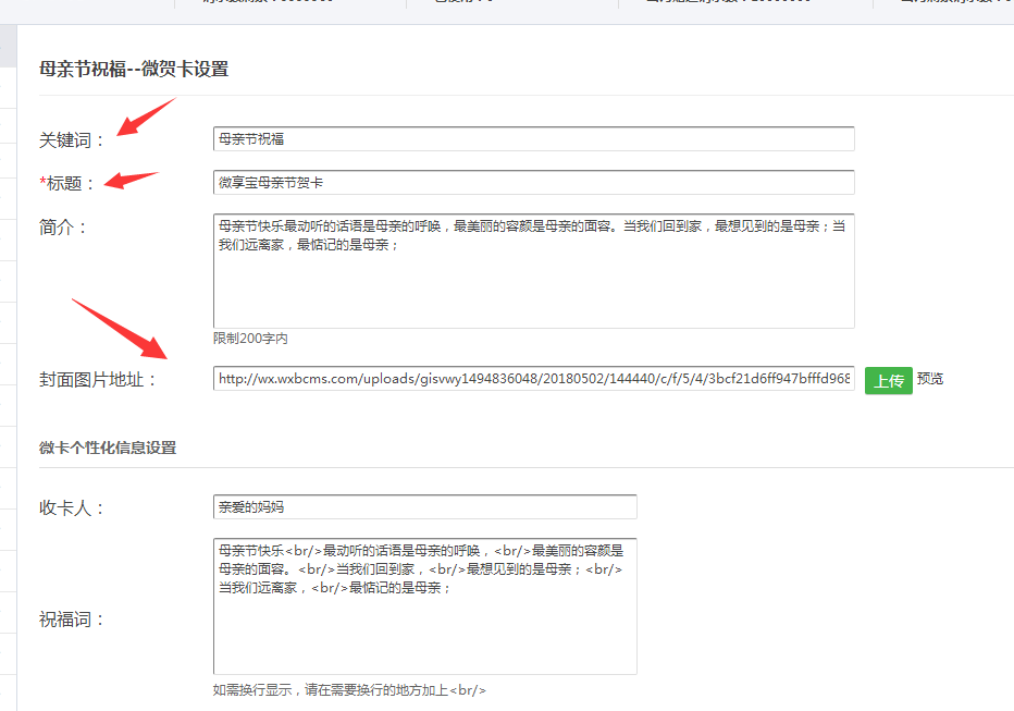 2.在左侧菜单贺卡库里选择节日或邀请之类的贺卡,这里我们以母亲节为例,为大家演示下,点击使用此贺卡,分别对设置关键词和图文消息封面进行编辑上传.