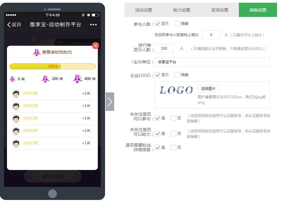 5.活动助力设置,可以选择计量单位,例如里程,选择不同的助力玩法和助力次数,下面的根据自己的需求勾选即可