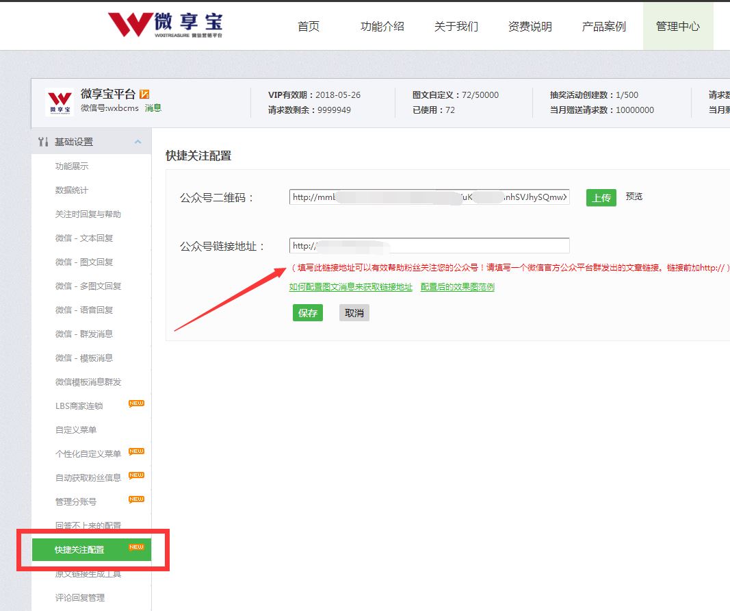 2.在左侧基础设置里面找到自动获取粉丝信息,选择获取头像昵称,开启,保存。然后找到快捷关注配置,把群发过的那篇图文链接粘贴上去,保存。