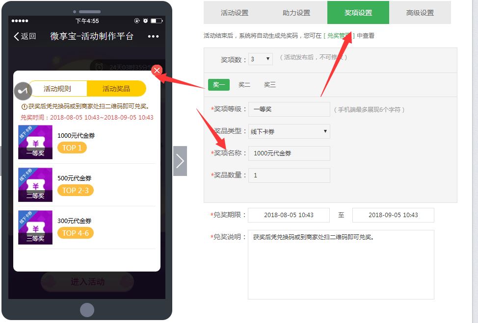 6.切换到奖项设置,选择奖项类型,设置奖'品,然后切换到高级设置,注意里面勾选需要先关注和粉丝信息。