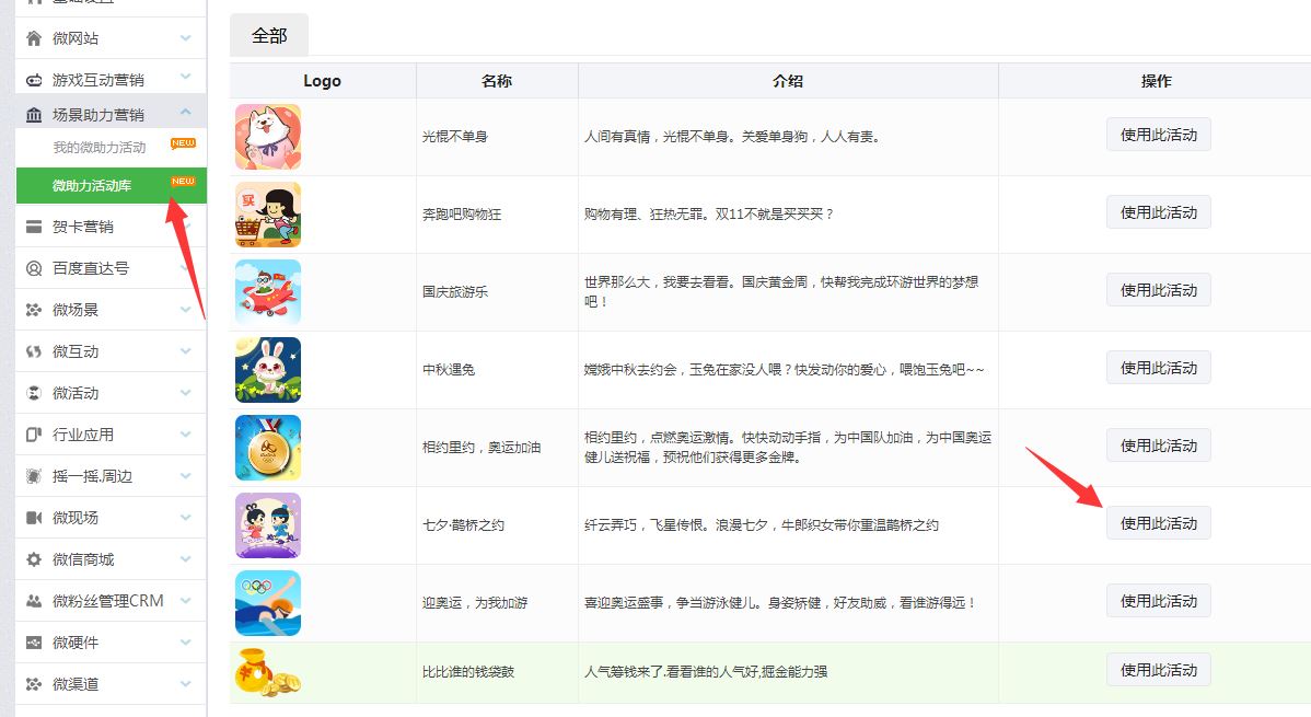 3.接着在左边目录里,点击场景助力营销,点击游戏库,通过搜索或者翻页的方式找到这情人节的助力游戏-七夕·鹊桥之约,选择一个点击我要使用此活动就可以进行编辑了。