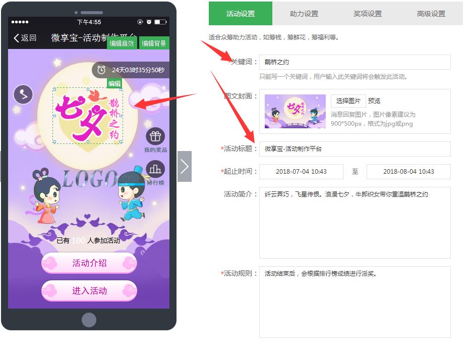 4.可以看到左侧是预览框右侧是编辑区域,上方是菜单导航,如果要修改游戏过程中出现的内容,就从上方菜单里选择,然后鼠标移动到预览框里出现编辑字样,点一下编辑上传替换就行。在右侧设置好有活动的关键词、时间,活动简介和规则