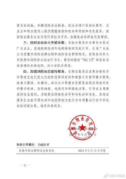5月11日,成都市物业管理协会发布关于进一步加强物业服务区域电动车停放充电管理的紧急通知:坚决制止在楼梯间、安全出口处等公共区域停放电动车!(四川观察)