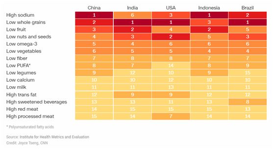 值得注意的是,在与饮食有关的死亡率上,中国在195个国家中排名第140位(排名越靠后,与饮食有关的死亡比例越高),而中国最大的饮食风险因素是钠摄入过高。