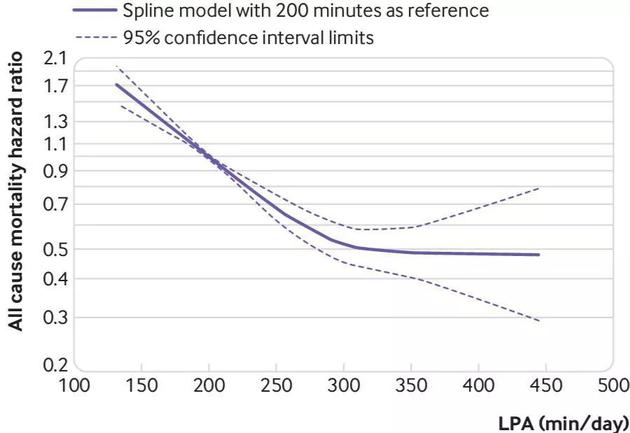 而且哪怕很少量的活动也有健康获益。最不活跃组与次不活跃组的死亡风险都差别很大,每天仅仅是多慢走60分钟,或多快走5分钟,死亡风险就分别降低42%和46%。