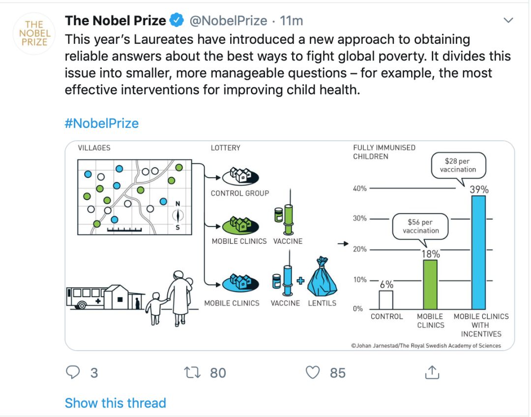 而今年的诺贝尔经济学奖得主引入了一种新的方案以应对全球贫困问题,那就是将这一问题分解成一个一个更小的、更易解决的问题,如通过补习辅导提高差生的教育成果、提高儿童健康等。他们通过设计好的实验验证,这些更小的、更具体的问题通常都能得到很好的解决。