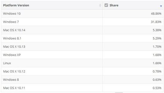 在经得用户同意下收集的匿名数据表明,38%的消费者和小微企业仍在使用Windows 7系统。在中小型企业(SMB)中这个占比更高,目前有47%的设备依然运行Windows 7系统。好消息是Windows 10成为每个人的首选桌面系统。目前有53%的消费者使用Windows 10系统,在小微企业中的适用率达到了55%,而在中小型企业中的占比只有47%。