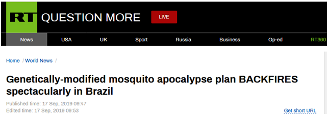 RT报道称,在接下来的18个月,情况完全逆转:雅科比纳地区的蚊子数量恢复到了转基因蚊子被释放前的水平。