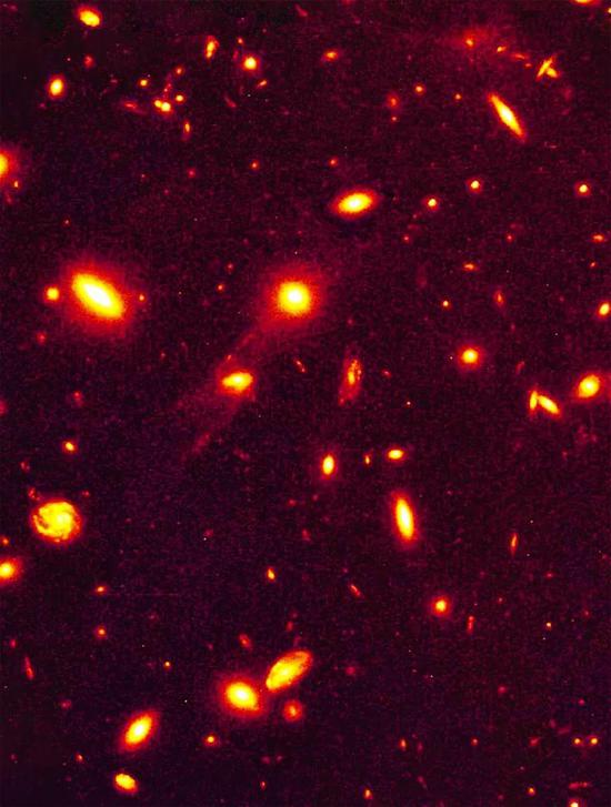 在宇宙的年龄只有现在的五分之三时,星系团是宇宙代表性的景观。哈勃望远镜已经在轨道上运行了22年,通过它的持续观测,我们得到了星系团的影像。有些星系看上去互相处在对方的引力场里。这样的相互作用在离我们较近的星系团中相当少见,说明宇宙确实在演化。