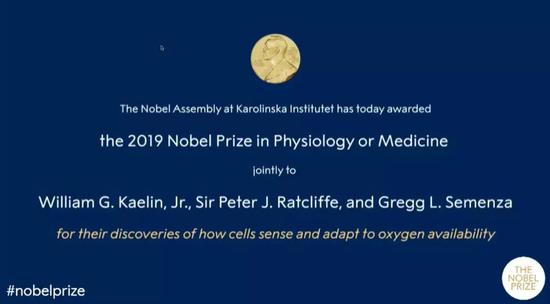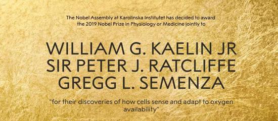 北京时间2019年10月7日17点30分,2019年诺贝尔生理学或医学奖揭晓,得主为William G。 Kaelin Jr,Peter J。 Ratcliffe和Gregg L。 Semenza,获奖理由为“他们发现了细胞如何感知和适应氧气供应”。