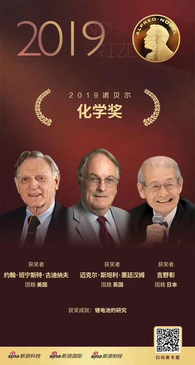 新浪科技讯 北京时间10月9日消息,瑞典皇家科学院决定将2019年诺贝尔化学奖授予约翰·古迪纳夫(John B。 Goodenough)、斯坦利·威廷汉(M。 Stanley Whittingham)和吉野彰,以表彰他们对锂离子电池的研究。这种可充电电池为手机和笔记本电脑等无线电子产品奠定了基础,还使一个无化石燃料的世界成为可能。从为电动汽车提供动力,到储存可再生能源,锂离子电池展现出了广泛的用途。
