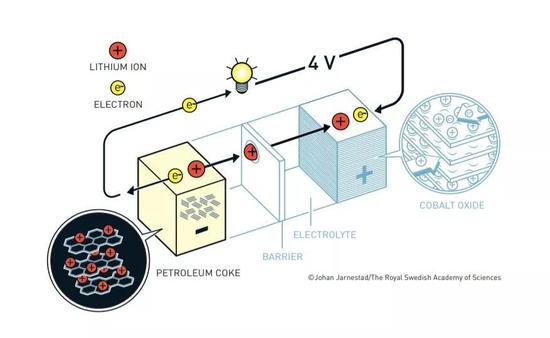 吉野彰开发了第一个商业上可行的锂离子电池。他在阴极中用了古迪纳夫的锂—钴氧化物,但在阳极用了一种碳材料——石油焦炭,它也可以嵌入锂离子。电池不再是基于分解电极的化学反应,而是基于锂离子在阳极和阴极之间来回流动,这使电池的寿命大大延长。