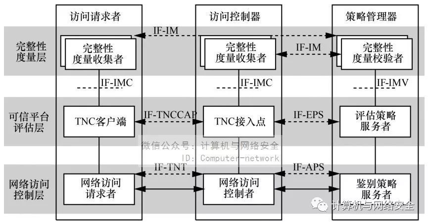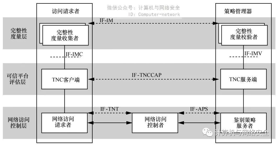 可信网络连接(TNC)是对可信平台应用的扩展,其目的是确保网络访问者的完整性,其认证过程可简述为:终端在接入网络的过程中,先后对终端用户身份、终端平台身份、终端平台可信状态等信息进行认证,只有全部满足认证需求的情况下才允许接入网络。