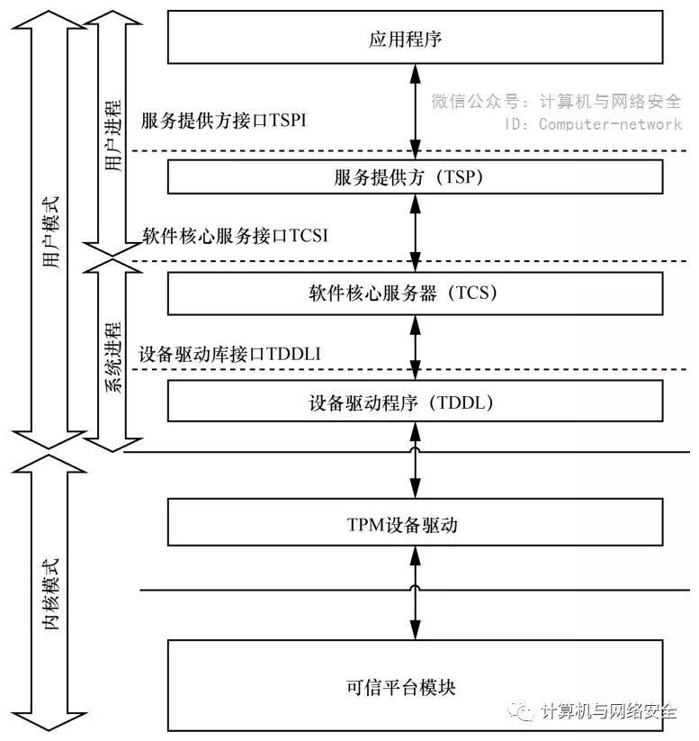 TSS(TCG Software Stack)是可信计算平台上TPM的支撑软件。 TSS 的作用主要是为操作系统和应用软件提供使用TPM的接口。